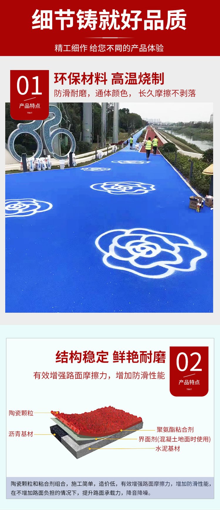 彩色防滑陶瓷颗粒路面采用的颗粒是经由1250℃高温烧制而成陶瓷粒,具有高硬度、不褪色、粒径均匀、耐污染环保型材质等特点,而聚氨酯粘合剂具有抄强粘接力和适宜的柔韧性。二者结合制作防滑路面就能很好的起到不掉砂、不产生收缩裂缝、耐污性好。