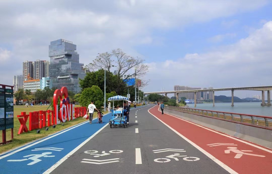 西江碧道蓬江段是市、区碧道工程,项目选址在潮连大桥至鹤山杰州,全长22.1公里,投资约2.12亿元,由蓬江区天沙河管理处负责组织实施。其中,已开放的4公里示范段,主要包括蓬江国际马拉松公园、篁边驿站、碧道运动公园三个景观节点。